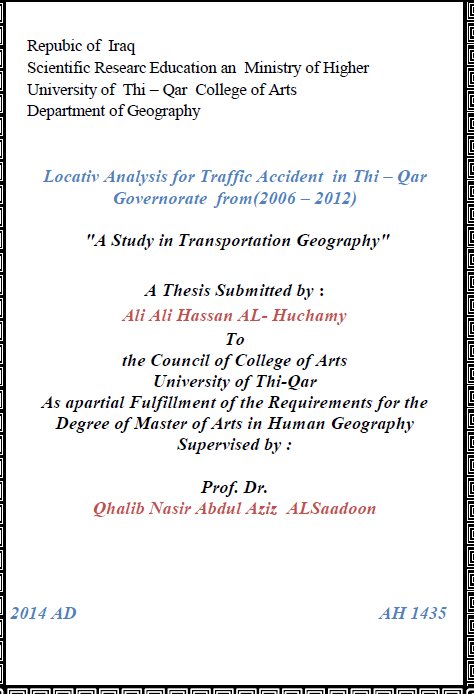 رسالة ماجستير عن حوادث المرور. التحليل المكاني للحوادث المرورية في محافظة المثنى للمدة 2005 2017 كرار ماجد كريم الجياشي رسالة ماجستير 2018 م. المنهج الإحصائي من خلال التعامل مع. حوادث سقوط كسقوط مركبة في الماء. وتكون بين مركبة وجسم ثابت.